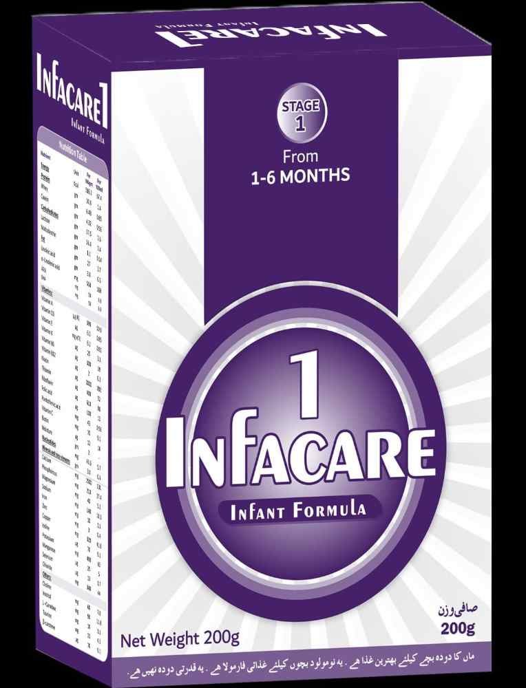 Infacare 1 - Soft Pack Infacare 1 is a 200gm, soft pack milk formula which is scientifically made for babies up to 6 months to fulfill their nutritional needs. Infacare 1 is fortified with iron to help growth and development of babies up to 6 months. Infacare 1 contains casein and whey proteins ratio equivalent to mother’s milk. It contains soya oil which is rich source of Omega-3 & Omega-6 fatty acids essential for brain development and immunity. It also contains DHA, ARA, Zinc, B- Complex vitamins along with Vit. A, D, E, K & Folic Acid.